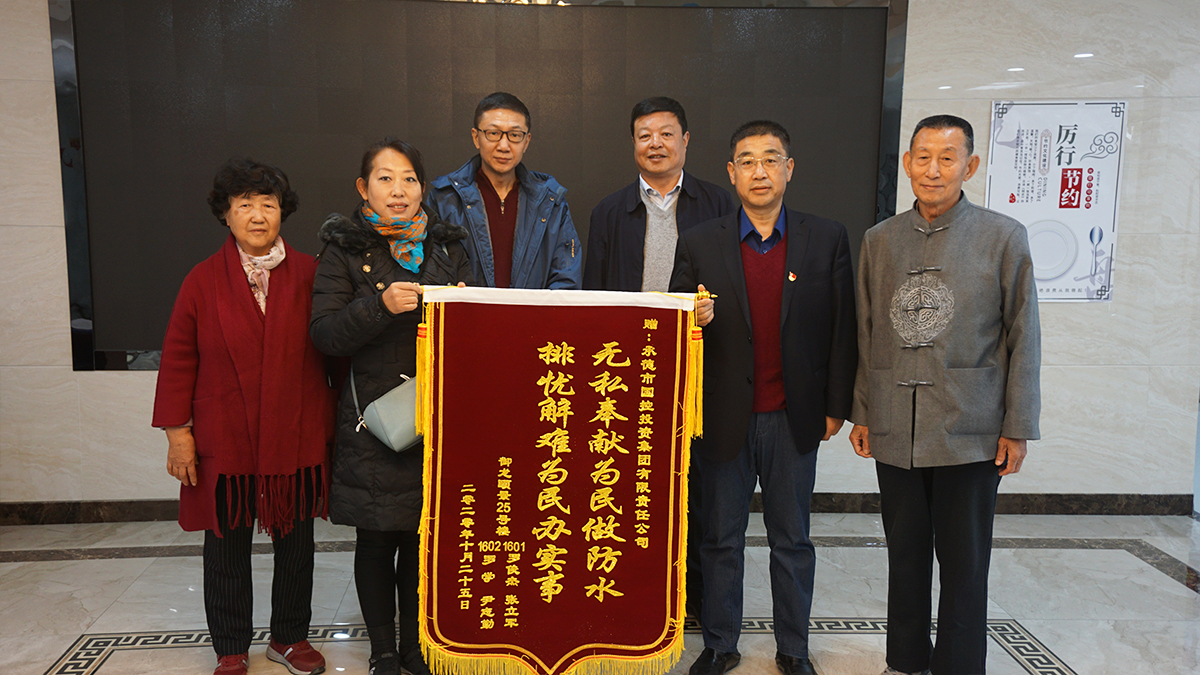 10月28日上午,市區(qū)御龍頤景小區(qū)的四位居民將一面繡有“無(wú)私奉獻(xiàn)為民做防水,排憂(yōu)解難為民辦實(shí)事”的錦旗送到集團(tuán)公司,表達(dá)了對(duì)集團(tuán)公司出資解決御龍御景小區(qū)房屋漏水問(wèn)題的感謝之情。