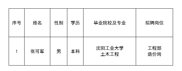 因公司發(fā)展需要,承德市國越房地產(chǎn)開發(fā)有限公司委托第三方機構(gòu)面向社會公開工程部造價崗員工1名?,F(xiàn)對擬錄用人員信息進行公示,公示期間如有異議,可通過電話、信函等方式反映,反映意見請署真實姓名。