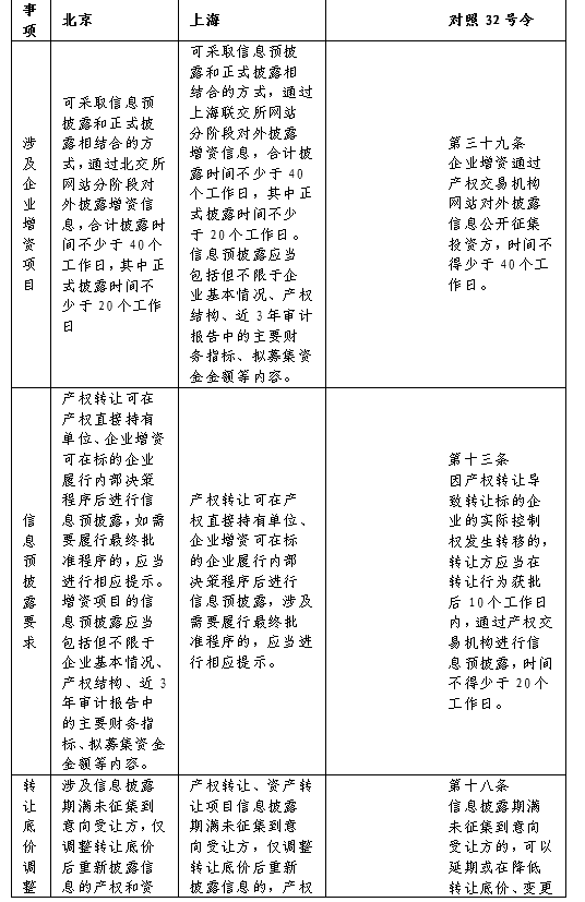六、企業(yè)增資可采取信息預(yù)披露和正式披露相結(jié)合的方式,通過(guò)產(chǎn)權(quán)交易機(jī)構(gòu)網(wǎng)站分階段對(duì)外披露增資信息,合計(jì)披露時(shí)間不少于40個(gè)工作日,其中正式披露時(shí)間不少于20個(gè)工作日。信息預(yù)披露應(yīng)當(dāng)包括但不限于企業(yè)基本情況、產(chǎn)權(quán)結(jié)構(gòu)、近3年審計(jì)報(bào)告中的主要財(cái)務(wù)指標(biāo)、擬募集資金金額等內(nèi)容。七、產(chǎn)權(quán)轉(zhuǎn)讓可在產(chǎn)權(quán)直接持有單位、企業(yè)增資可在標(biāo)的企業(yè)履行內(nèi)部決策程序后進(jìn)行信息披露,涉及需要履行最終批準(zhǔn)程序的,應(yīng)當(dāng)進(jìn)行相應(yīng)提示。(與32號(hào)文相應(yīng)規(guī)定相比,將增資行為作為法定信息披露的內(nèi)容)